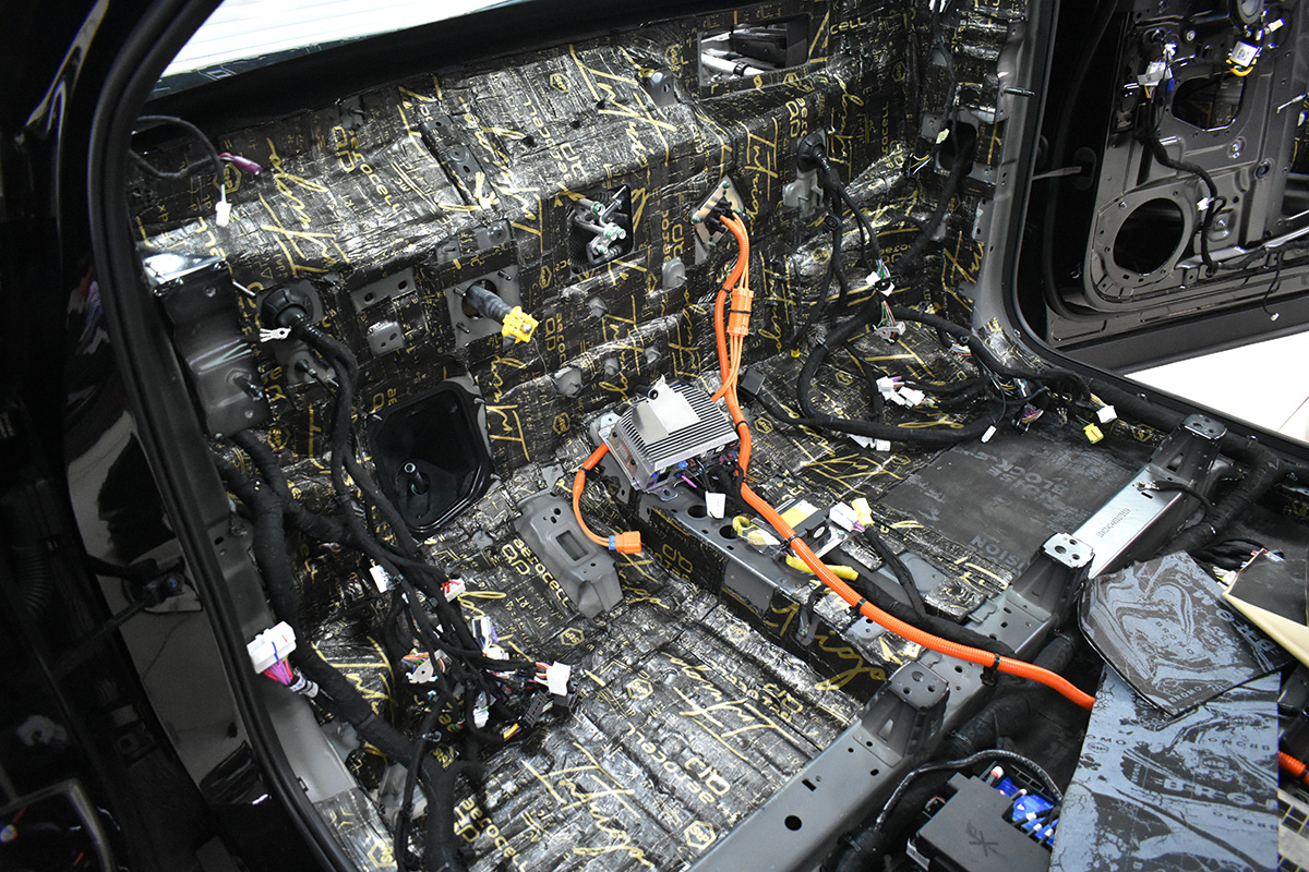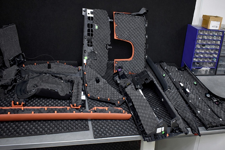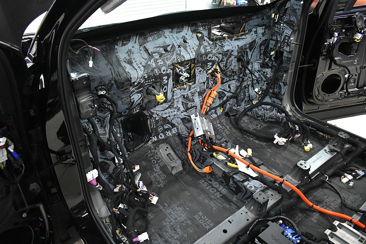 На пол салона, багажника, под сиденьями второго ряда, задние арки, крылья смонтировали универсальный материал Aerocell QP Intrigo 6 мм. Он выполняет функции вибродемпфера, теплоизолятора и шумопоглотителя. То есть эфективно снижает вредные вибрации, улучшает теплоизоляцию салона. Aerocell QP Intrigo 6 мм также установили на внешнюю поверхность дверей. В качестве пыльника использовали StP Aerocell QP Genio 4 мм.