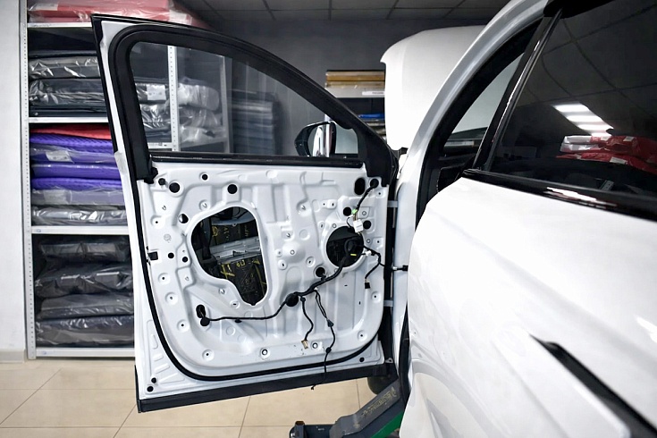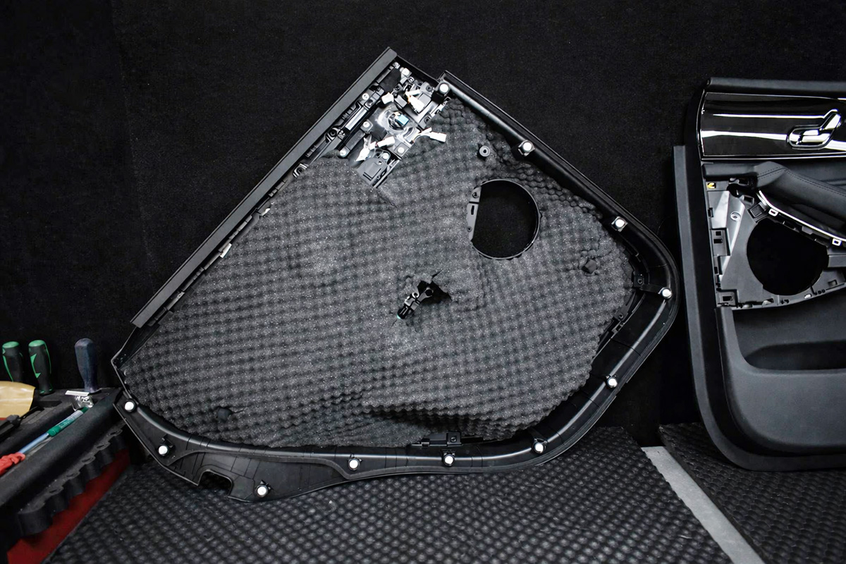 Дверные карты максимально закрываем шумопоглотителем StP Biplast Premium 15A Armor с повышенной площадью рабочей поверхности. Благодаря открытоячеистой структуре рабочего слоя он эффективно гасит энергию звуковых волн и снижает уровень нежелательного шума в салоне.
