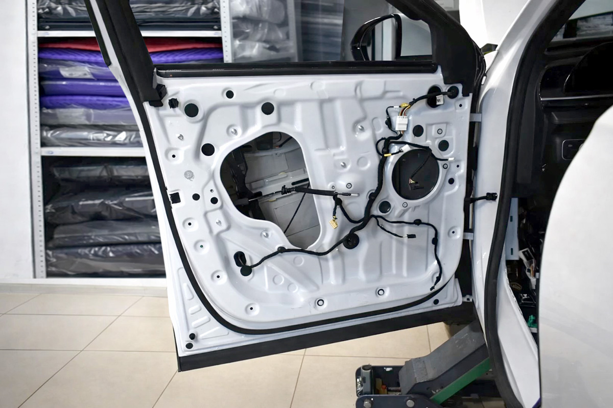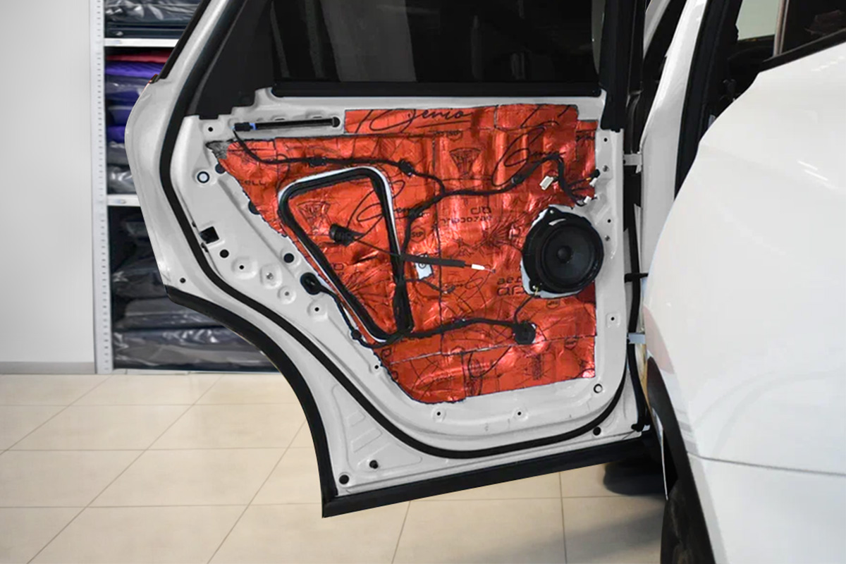 Внутренняя поверхность двери — многофункциональный материал StP Aerocell QP Genio 4 mm. Он гасит паразитные вибрации поверхности, на которую непосредственно монтируются динамики аудиосистемы. Genio уменьшает помехи и формирует из двери «акустический короб».