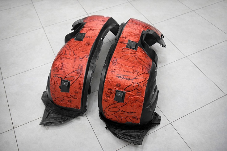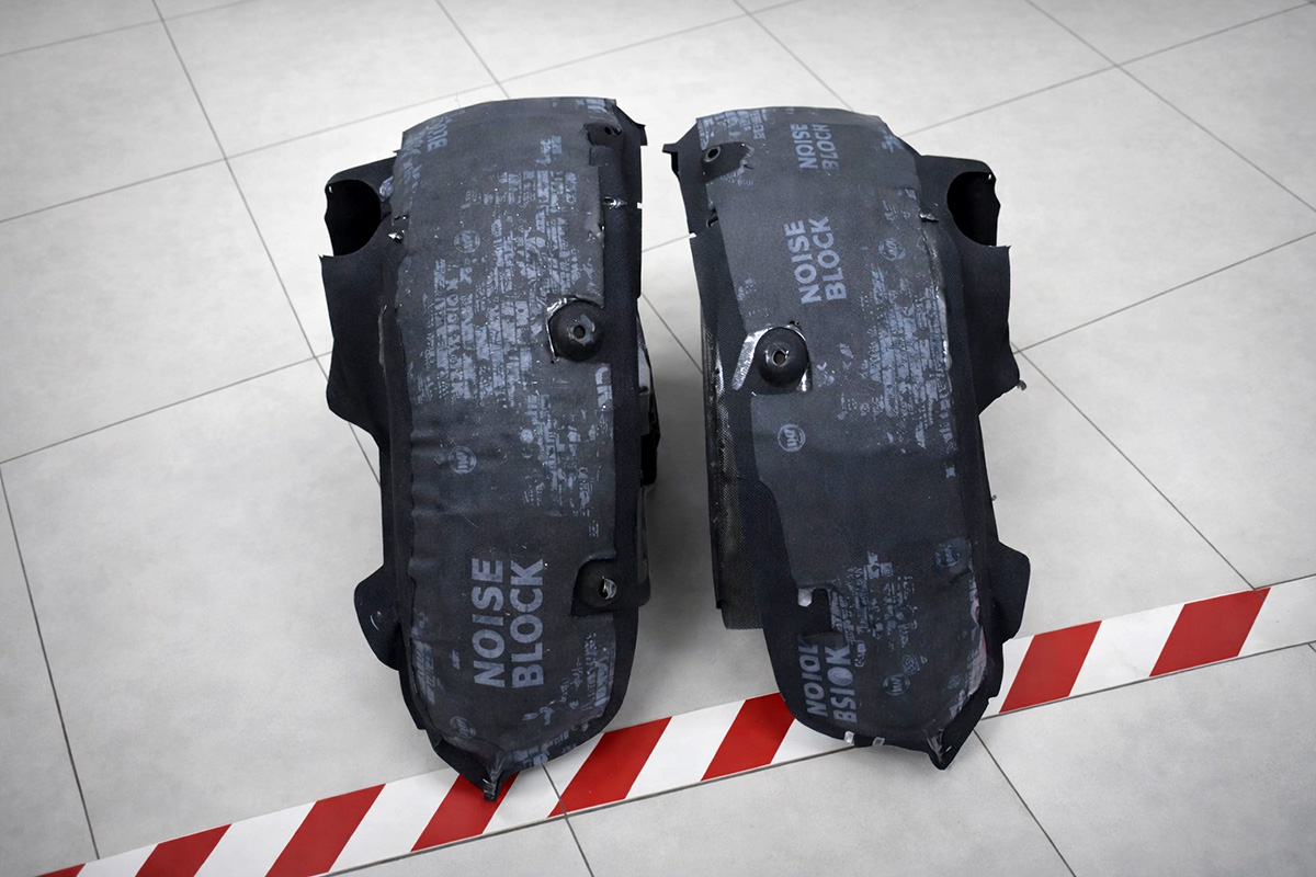 Войлочные подкрылки, наоборот, поглощают шум. Чтобы усилить этот эффект, мы смонтировали на них звукоизолирующую мембрану StP NoiseBlock 2. Предварительно поверхность была обработана специальной мастикой «StP NoiseLiquidator для войлочных локеров».