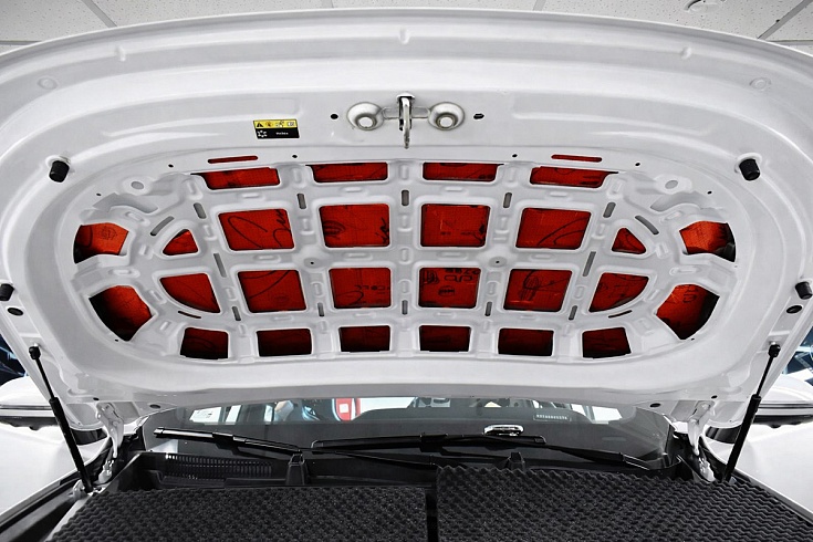 По аналогичной технологии обрабатываются элементы багажника. На задние арки предварительно прикатывается материал StP F200. Пол багажника, арки, крылья и ниша под запасное колесо обрабатываются первым слоем — StP Aerocell QP Intrigo 6 mm.