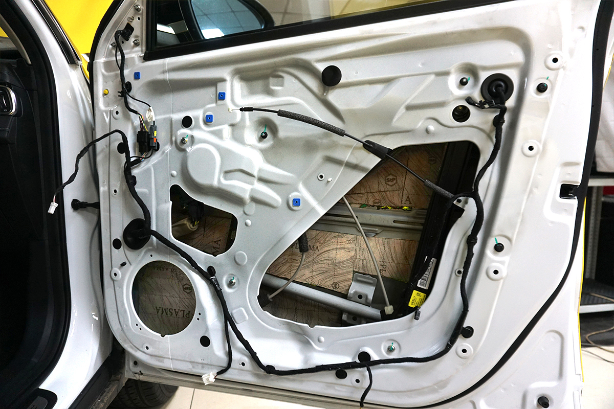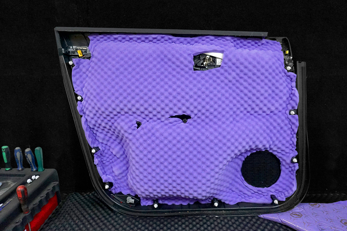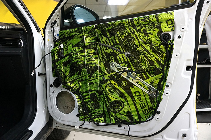 На дверные обшивки нанесли слой шумопоглотителя StP Biplast Wave 15, чтобы исключить посторонние звуки и дребезг пластиковых деталей.