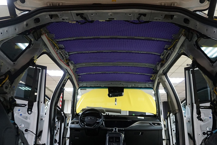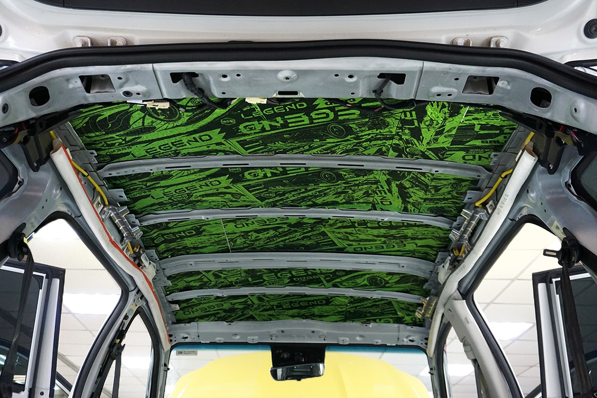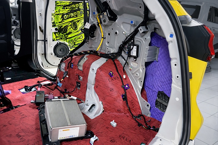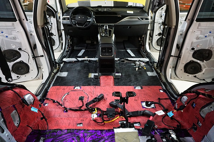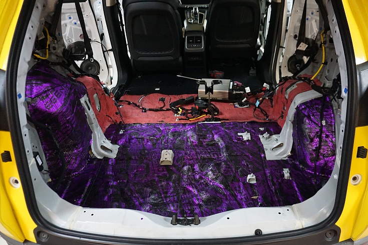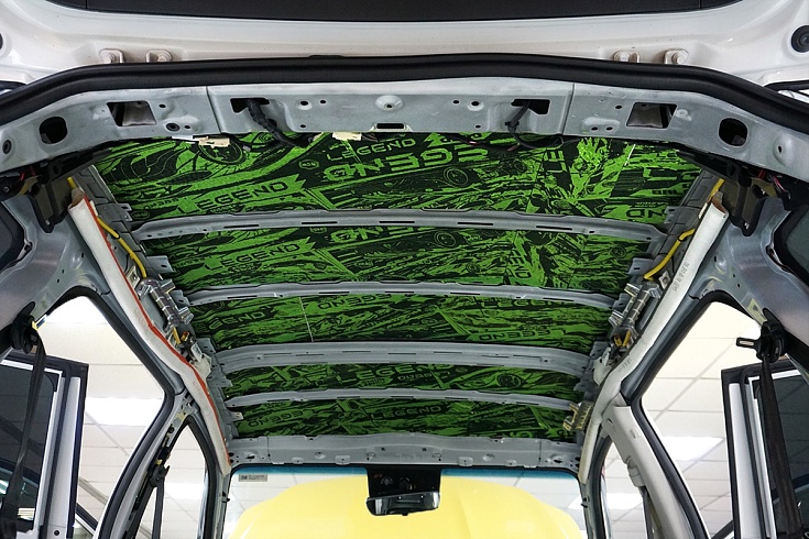 Для борьбы с шумом от дороги на передний пол уложили двухслойный влагостойкий сэндвич StP Magma с комбинированными свойствами звуко- и теплоизоляции. Под сиденьями второго ряда и на тоннель смонтировали шумопоглощающий сэндвич StP Lava на основе переработанного пенополиуретана.