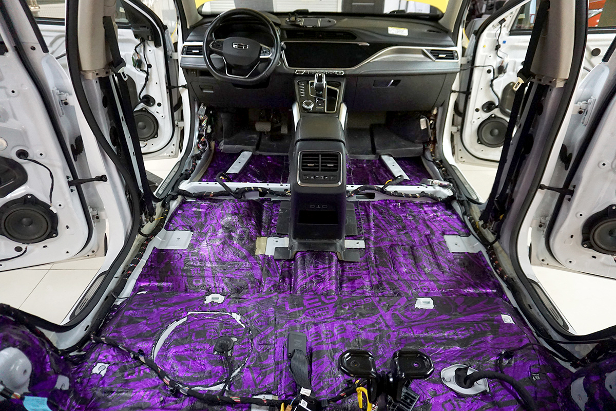 Пол автомобиля Geely Atlas требует особого внимания. Он — источник сильных вибрационных волн, возникающих в трансмиссии. Прикатали 4-миллиметровый вибродемпфер StP Legend 4 (КЭМ 32,9%). Мощная адгезия материала к поверхности делает его надежным и долговечным антикором.