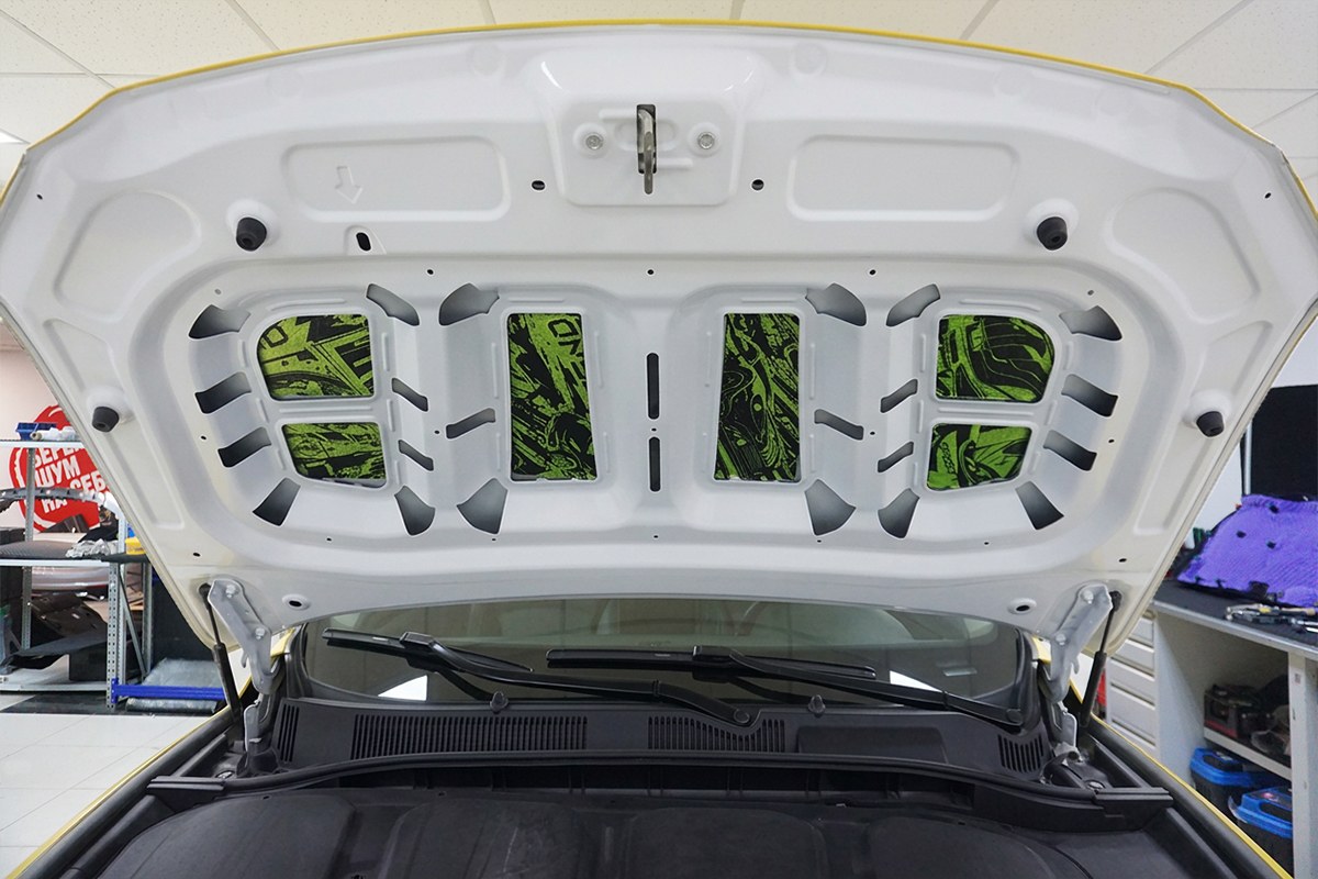 Работающий ДВС — не только источник шума, но и мощный генератор постоянных вибраций, которые передаются в салон через металлические конструкции кузова. Для борьбы с ними и для снижения дребезга во время движения обработали капот лёгким вибродемпфером StP Legend 2 с коэффициентом эффективности материала (КЭМ) 17,5%.