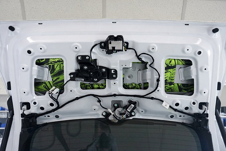 Применили «лёгкую технологию» при обработке крышки багажника, чтобы не нагружать упоры. Металлическая поверхность (зонально) — вибродемпфер StP Legend 2. Дверная карта (полностью) — шумопоглотитель StP Biplast 15 Wave.