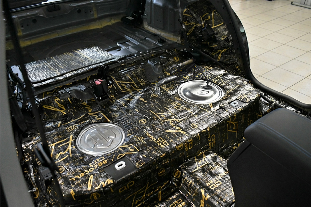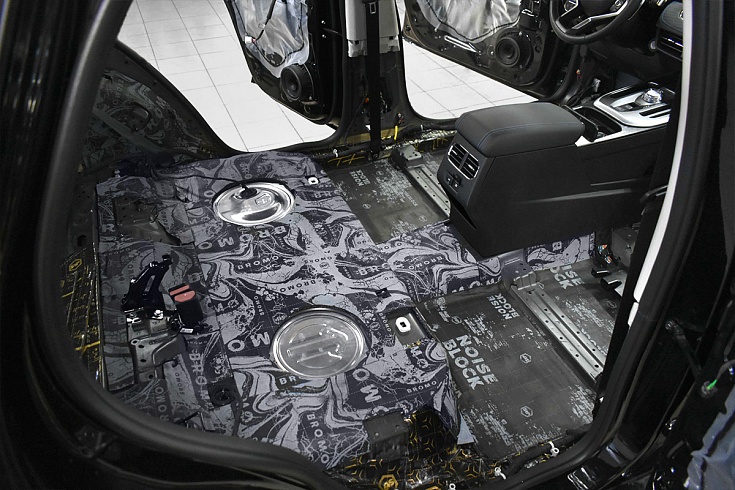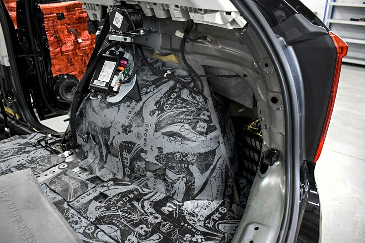 На тоннель, под сиденья второго ряда, в багажник (пол, арки, ниша) смонтировали двухслойный сэндвич StP Bromo. Открытоячеистая структура мягкого слоя эффективно гасит основную часть энергии звуковых волн. Мембрана сэндвича StP Bromo служит дополнительным звукоизолятором.