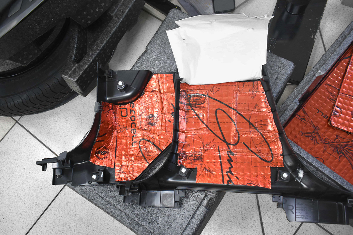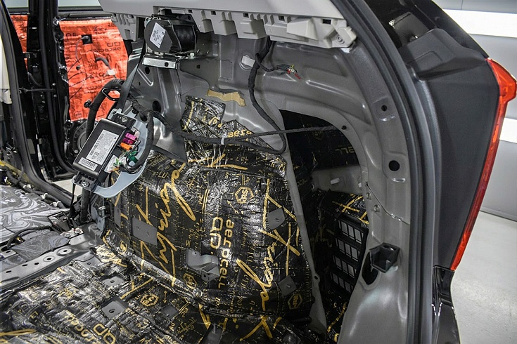 Пол автомобиля — сильновибронагруженная зона. Конструктивные шумы поступают и от дороги, и от трансмиссии. Пороги, арки и зону под сиденьями второго ряда (зонально) обработали укрепляющей фольгой F200. Затем прикатали по максимуму многофункциональный материал Aerocell QP Intrigo 6 мм — обработали пол салона, тоннель, зону под сиденьями второго ряда, пол багажника, арки, крылья. QP Intrigo является надёжным вибродемпфером, звуко- и теплоизолятором.