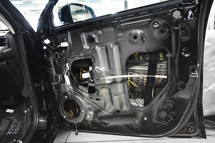 юДвери автомобиля — источник шума, попадающего в салон с улицы. Особенно это заметно при езде по оживленному городу или на шоссе с активным встречным движением. Внешнюю поверхность дверей обработали влагостойким универсальным материалом Aerocell QP Intrigo. Он гасит вибрации металла и улучшает теплоизоляцию автомобиля.