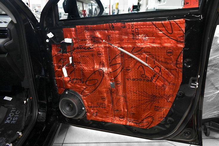 Вторым слоем смонтировали рельефный шумопоглотитель StP Biplast Premium 15K (armor) со специальной армированной подложкой. Он отвечает за формирование акустического комфорта в салоне, гасит паразитные реверберационные волны (эхо).