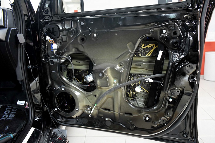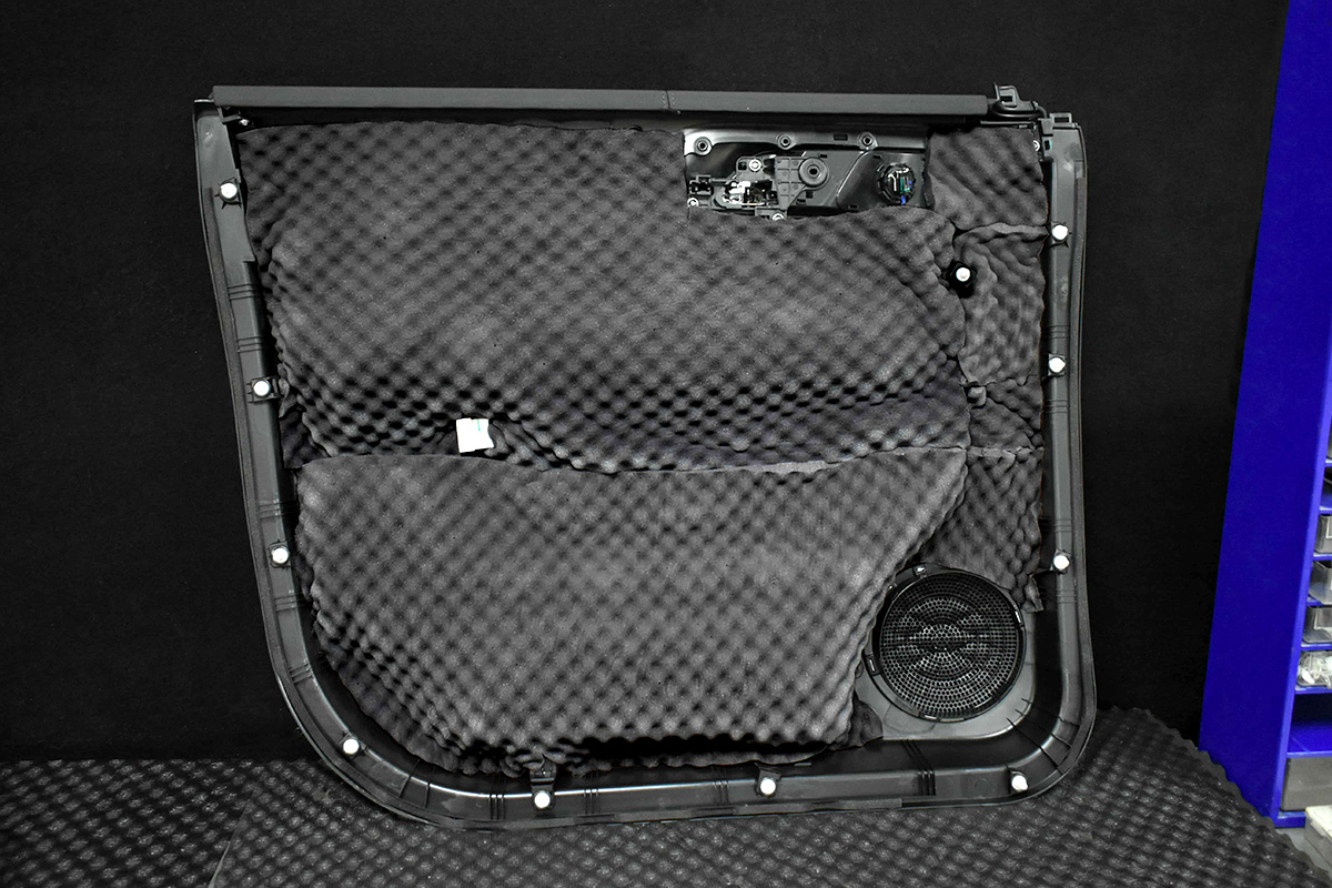 На дверные карты смонтировали шумопоглощающий материал StP Biplast Premium 15A (Armor) из вспененного вязкоэластичного полиуретана.