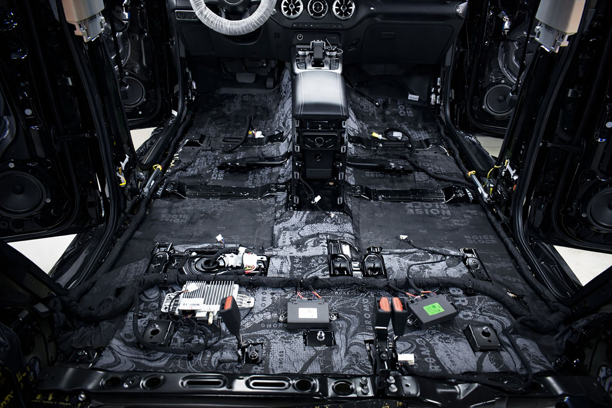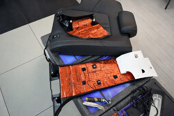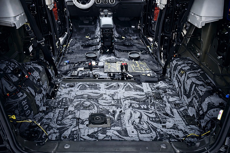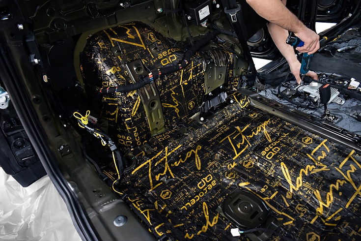 На зону под сиденьями второго ряда, пол багажника и арки смонтировали звукопоглощающий сэндвич StP Bromo. Открытоячеистая структура мягкого слоя эффективно рассеивает звук и уменьшает его амплитуду, мастичная мебрана не пропускает шум в салон.