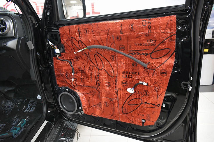 Шумоизоляция дверей автомобиля — это не только снижение обещего уровня шума в салоне, но и сохранение тепла и чистое звучание штатной акустики авто. На внутреннюю поверхность прикатали влагостойкий вибродемпфер Aerocell QP Intrigo.