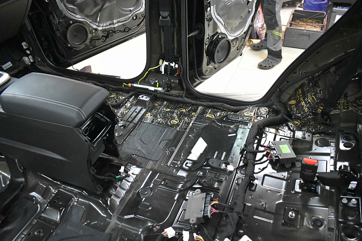 Передний пол прикрыли мощной звукоизолирующей мембраной StP NoiseBlock 2. Она отражает звуковые волны, пытающиеся проникнуть в салон из вне.
